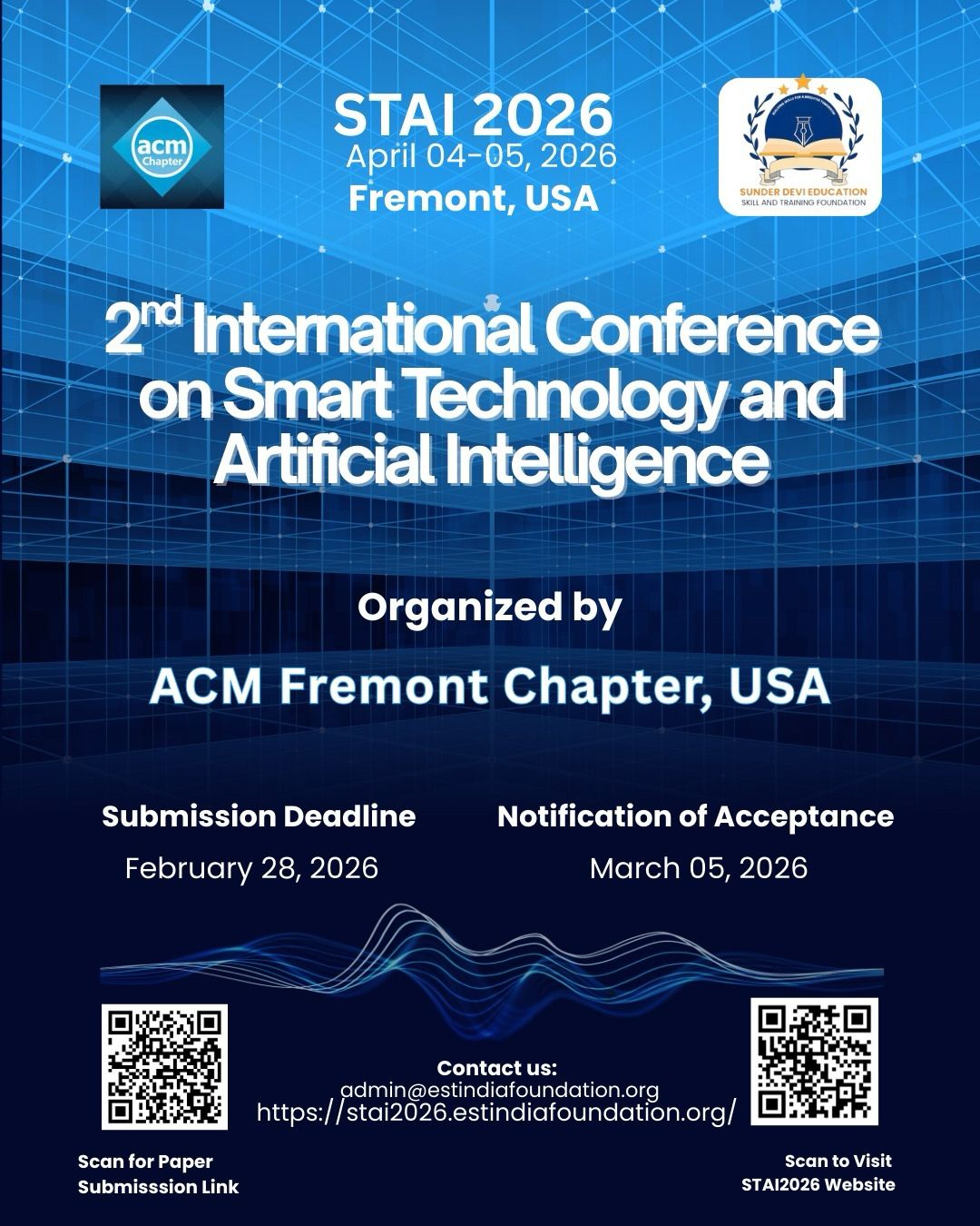 We are pleased to organize the 2nd International Conference on Smart Technology and Artificial Intelligence (STAI 2026), a premier forum for researchers, practitioners, and industry professionals to explore and discuss the latest innovations, trends, and challenges in smart technology and artificial intelligence.